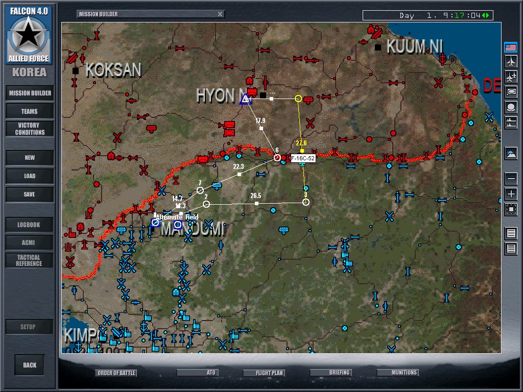 All flights have 4 Mavericks and one HARM anti-radar missile. The total number of Mavericks between all the flights is 24. There are 21 total vehicles you need to destroy. Feel free to add more or less HARMs to the other flights, but keep in mind that for every one HARM you add, that will take away 2 Mavericks. Conversely, every HARM you take away adds two more Mavericks to give you more of a cushion in case you miss a lot. If 3.5 hours pass(12:30 game time), the game is a stale mate and will end.