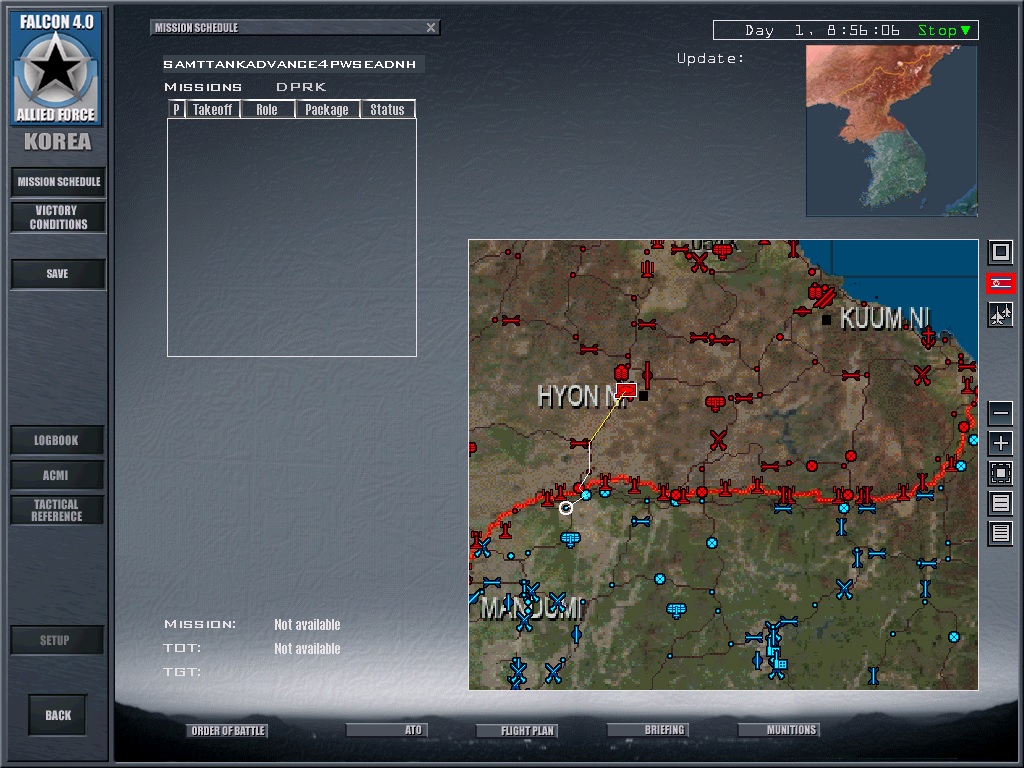1A-Single Player Version-30 T-90 tanks and 18 SA-17s have slipped through our defenses. The SA-17s have formed have positioned themselves along checkpoints. The tanks will advance along these checkpoints in order to make themselves be under SAM cover. The tanks need to be destroyed before they reach and occupy Ch'orwon. To see path of tank battallion, see picture here. To see flight path of a typical mission and the SAM sites in relation to it, see picture here.